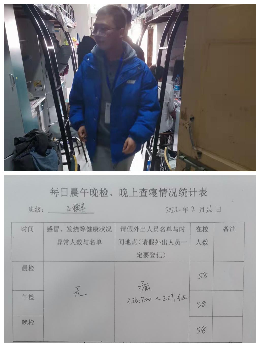 结合学校疫情防控工作的要求,自律部部认真积极开展常规工作,一是严格遵照《关于进一步做好学校疫情防控工作的通知》中的要求,督促同学们勤洗手、戴口罩、不聚集、不串门、不擅自外出、保持宿舍通风和清洁消毒措施。二是严格进行晚上查寝制度,校宿管会、院权益部、班级班委加强晚上就寝检查,发现异常情况及时汇报辅导员。三是组织各宿舍做好每日晨午晚检工作。班委深入学生宿舍,督促每间宿舍认真登记好《每日晨午晚检、晚上查寝情况统计表》,严格落实每日晨午晚检、晚上查寝登记制度,为同学们的健康平安保驾护航。