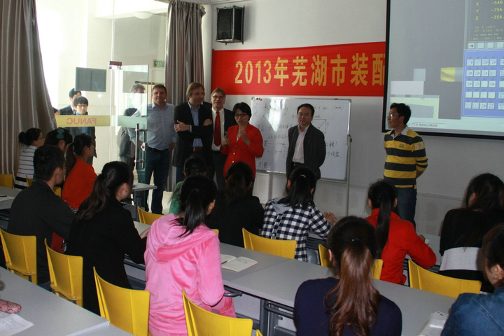 4月9日德盛镁公司的吴总以及德国宝马集团董事会成员、高管克劳斯先生等一行12人来到机械工程学院进行参观考察。德方客人此行重点考察了合作冠名班“德盛镁·宝马班”的相关情况,在合作班教学现场,克劳斯先生与学生们进行了亲切交流,勉励同学们刻苦钻研,将来到企业中取得良好发展。客人还参观了数控实训中心、以及FANUC技术中心、钳工实训中心、汽车学院的相关实训中心等。优美的校园环境、优良的教学条件给客人留下了深刻印象,克劳斯先生和随行的另外4名德方专家以及吴总等都对学院的各方面情况表示满意。表示将与机械工程学院深化合作,在2014级数控技术专业新生中招收“德盛镁·宝马班”,并且以后常年招生。据悉,德国宝马集团和芜湖的德盛镁汽车部件(芜湖)有限公司将为合作班提供相应的培训教材,德方还将派技术人员为学生上课。合作班的优秀学员还将赴德国培训。