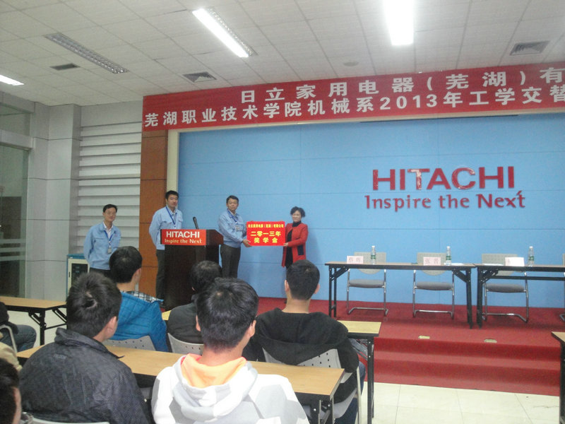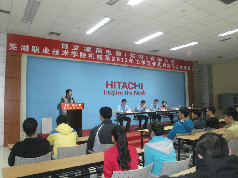 近日,机械工程学院2013年工学交替优秀实习生表彰仪式在芜湖日立家用电器有限公司隆重举行,参加仪式的嘉宾有,机械工程学院书记吴晓净、副院长戴晓东及优秀实习生代表,日立公司代表有,青柳本部长、蔡晖副部长、张进副课长。