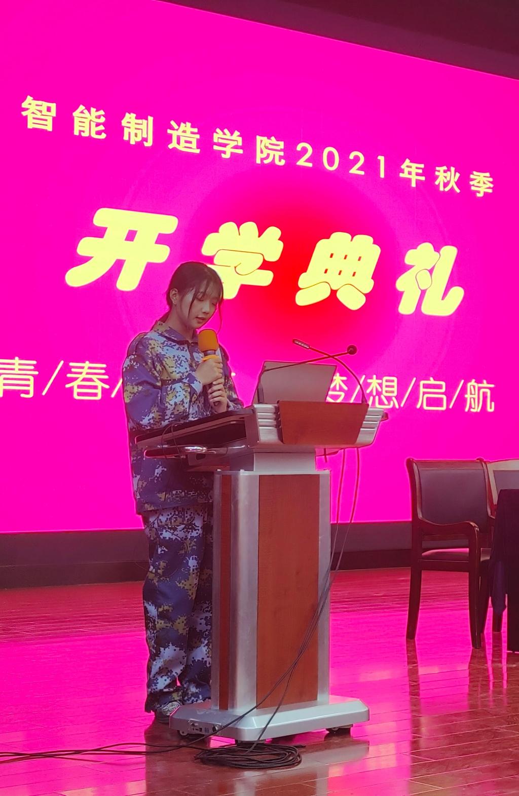 机械设计与制造专业带头人杨群作为教师代表发言,他谈到自律是大学生活的保障,告诫同学们“自律者出众,放纵者出局”。2019级彭张健同学作为优秀老生代表发言,分享了自己过去两年的学习经验和亲身经历。2021级新生代表徐玲莉同学表示全体新生一定会珍惜大学时光,不负每个人的厚望,努力提升自己,为国家发展和社会进步贡献力量。