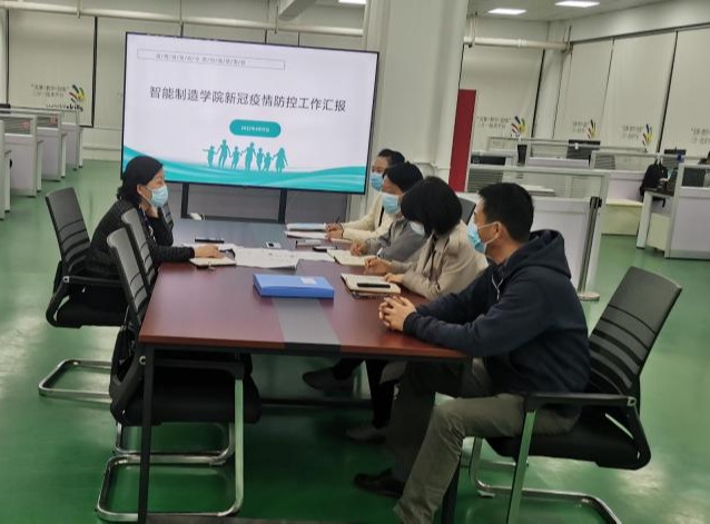 智能制造学院党总支副书记计荣代表学院汇报了近期疫情防控工作。学院严格落实省市和属地疫情防控政策要求,做实做细人员管控审批流程,切切实实“管好人”,对于重点人员“一人一案”;开展系列活动,丰富校园文化生活,让疫情防控工作有温度;党政班子成员和学生管理队伍经常深入教室、宿舍一线,贯彻落实好学校三级包保督查机制;积极组织师生参加学校志愿服务,做实做细各项工作。