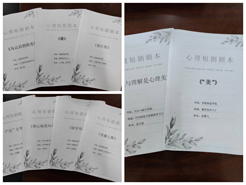 此次大赛共征集了20余份作品,这些作品主题立意鲜明,有教育意义;内容积极向上,贴近学生学习和生活实际。最终经过评选,智能制造学院张翼飞同学作品《“美”》与汽车与航空学院雷可重同学作品《交流与理解是心理美》荣获一等奖,除此之外还有许多优秀作品,剧本主题丰富,围绕校园疫情防控、人际关系、未来探索、个人成长、自我认识等方面,重点围绕爱党爱国、感恩励志、拼搏奋斗、奉献担当等内容展开,充分展现新时代青年直面学习生活中困难和挑战的信心和勇气、战胜疫情的决心、积极乐观的人生态度。