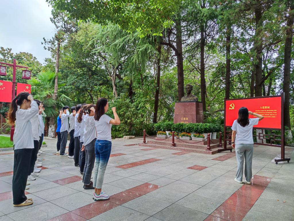 参观结束后,在王稼祥同志的雕塑前,在鲜红的党旗下,参观的党员师生面向党旗,重温入党誓词,“我志愿加入中国共产党,拥护党的纲领,遵守党的章程……”一句句铿锵誓言,表达了全体党员对党对国的无限忠诚,对共产主义的坚定信仰。
