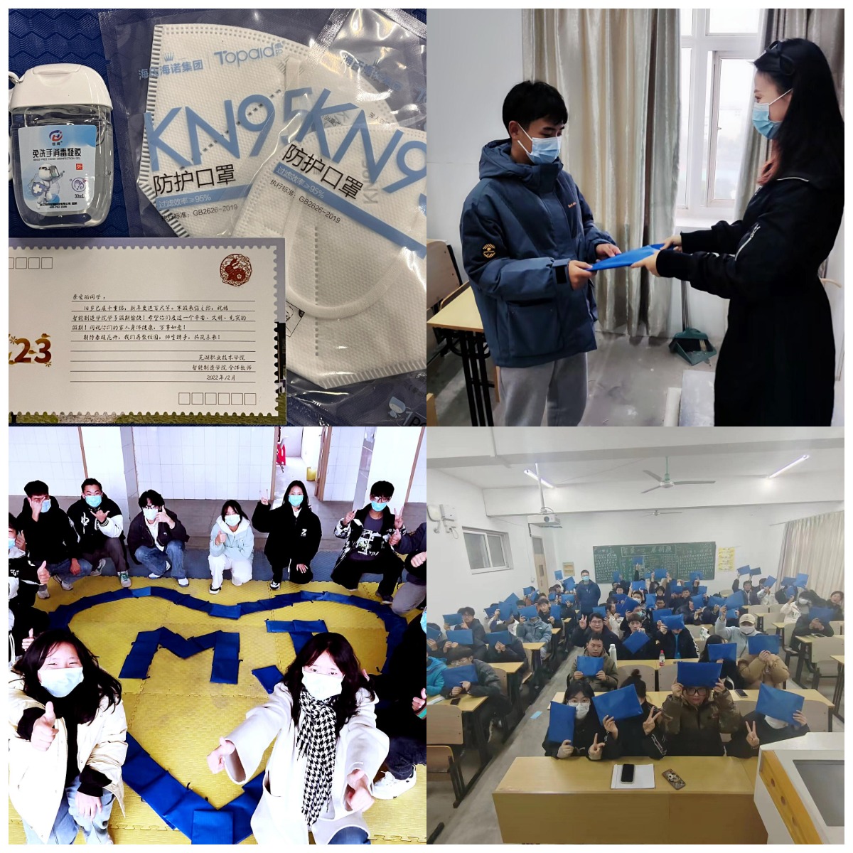 12月9日,正在进行期末复习备考的智能制造学院学生们收到了一份暖心手袋,里面装有两只N95防护用口罩、一瓶免洗消毒凝胶,还有一封智能制造学院全体教师写给同学们的祝福信。