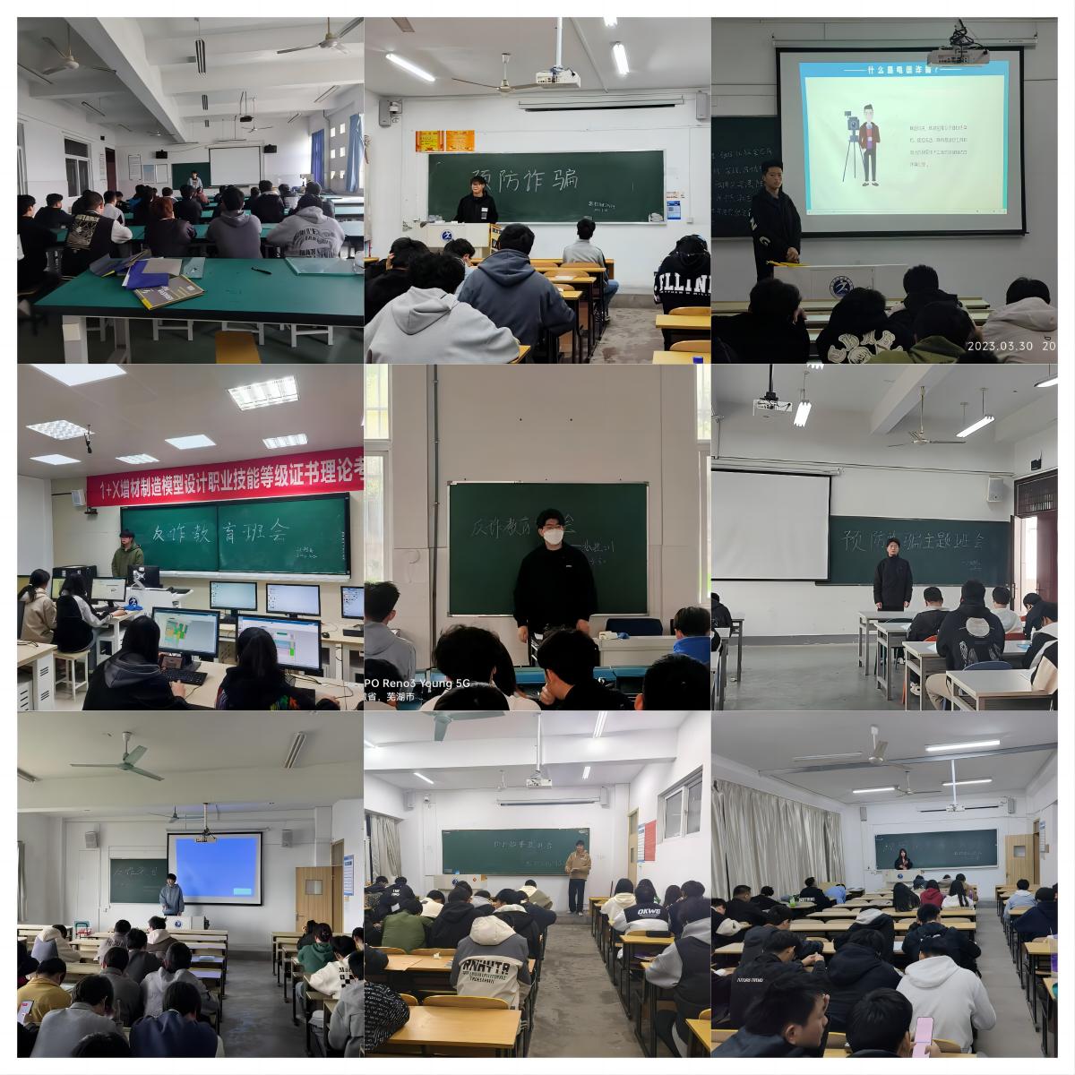 3月27日,学院召开辅导员工作会议,制定工作方案,强调各班级要加强对刷单等违法涉诈行为的教育与惩戒。会后,辅导员班主任深入班级、宿舍,开展全面排查;3月29日,智能制造学院以班级为单位开展了“青春护航·共建无诈校园”主题班会活动,对常见诈骗短信、诈骗电话、非法链接、非法软件等诈骗手段进行详细的解释说明,提高学生辨别能力。同时,辅导员班主任定期通过班级QQ群和微信群进行反诈预警和温馨提示,提醒同学们安装国家反诈中心APP,进一步在学生心中树立“我是自身安全第一责任人”的意识,切实让大学生体会电信诈骗的危害,持续强化学生的反诈意识,努力营造全员防诈的校园文化氛围。