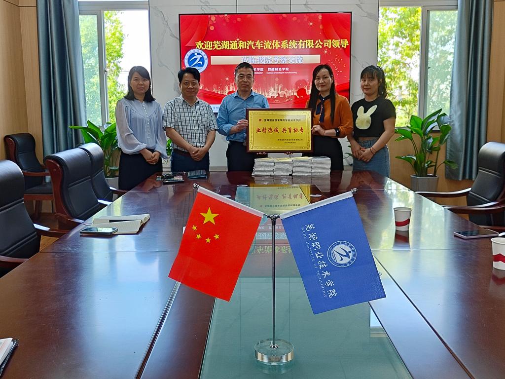 5月23日上午,芜湖通和汽车流体系统有限公司校企合作负责人陈薇一行赴智能制造学院开展校企合作调研交流,智能制造学院院长戴晓东、党总支书记计荣、党总支副书记林宗良,毕业班辅导员朱夔接待了陈薇一行。