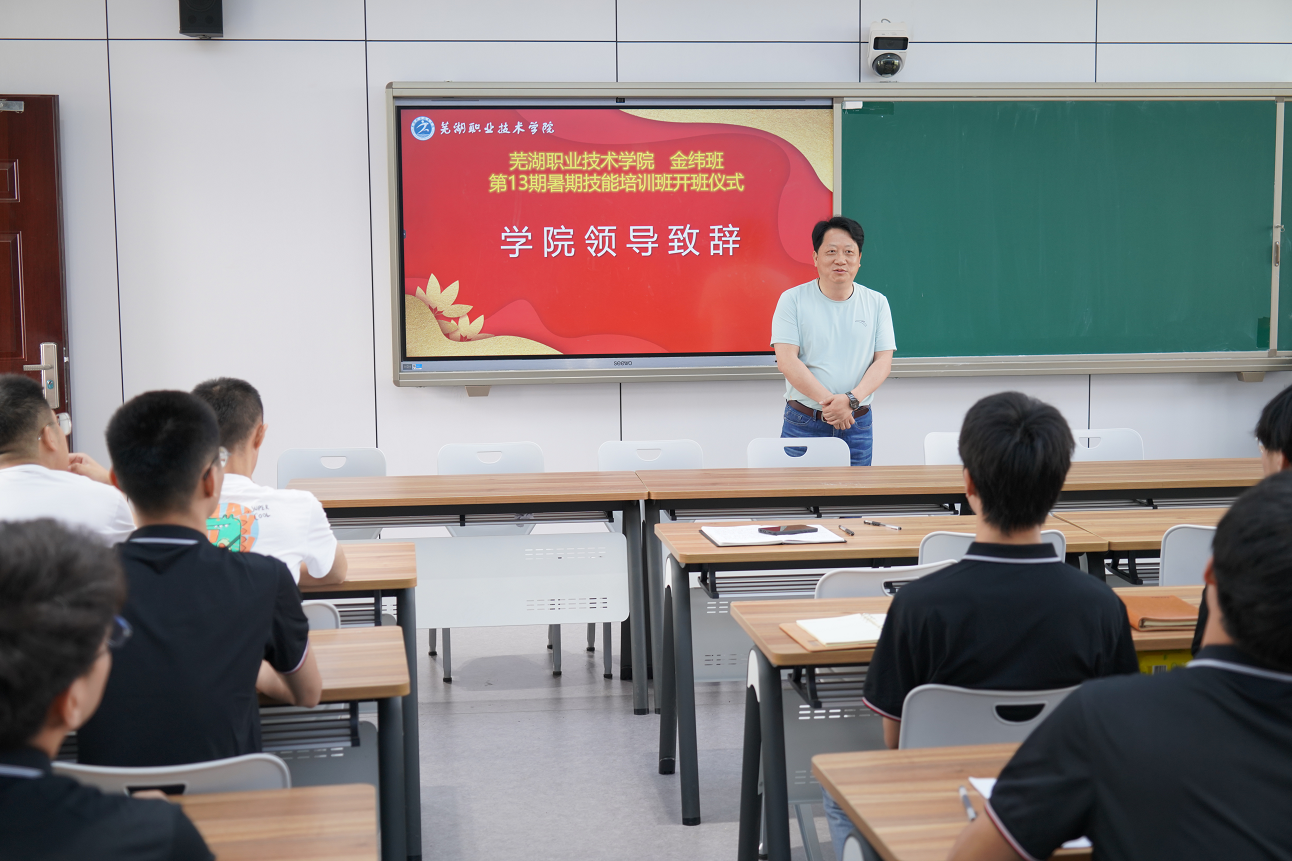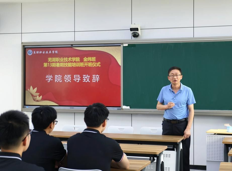 为了进一步提升金纬班学生的技能水平,6月26日上午9点,芜湖职业技术学院金纬班第十三期暑期技能培训在智能制造学院多媒体九教室举行了开班仪式。智能制造学院院长戴晓东、副院长陈永强、电气与自动化学院副院长邓延安、金纬班班主任张宇老师、相关教师代表及21级金纬机械与电气班全体同学出席了开班仪式。