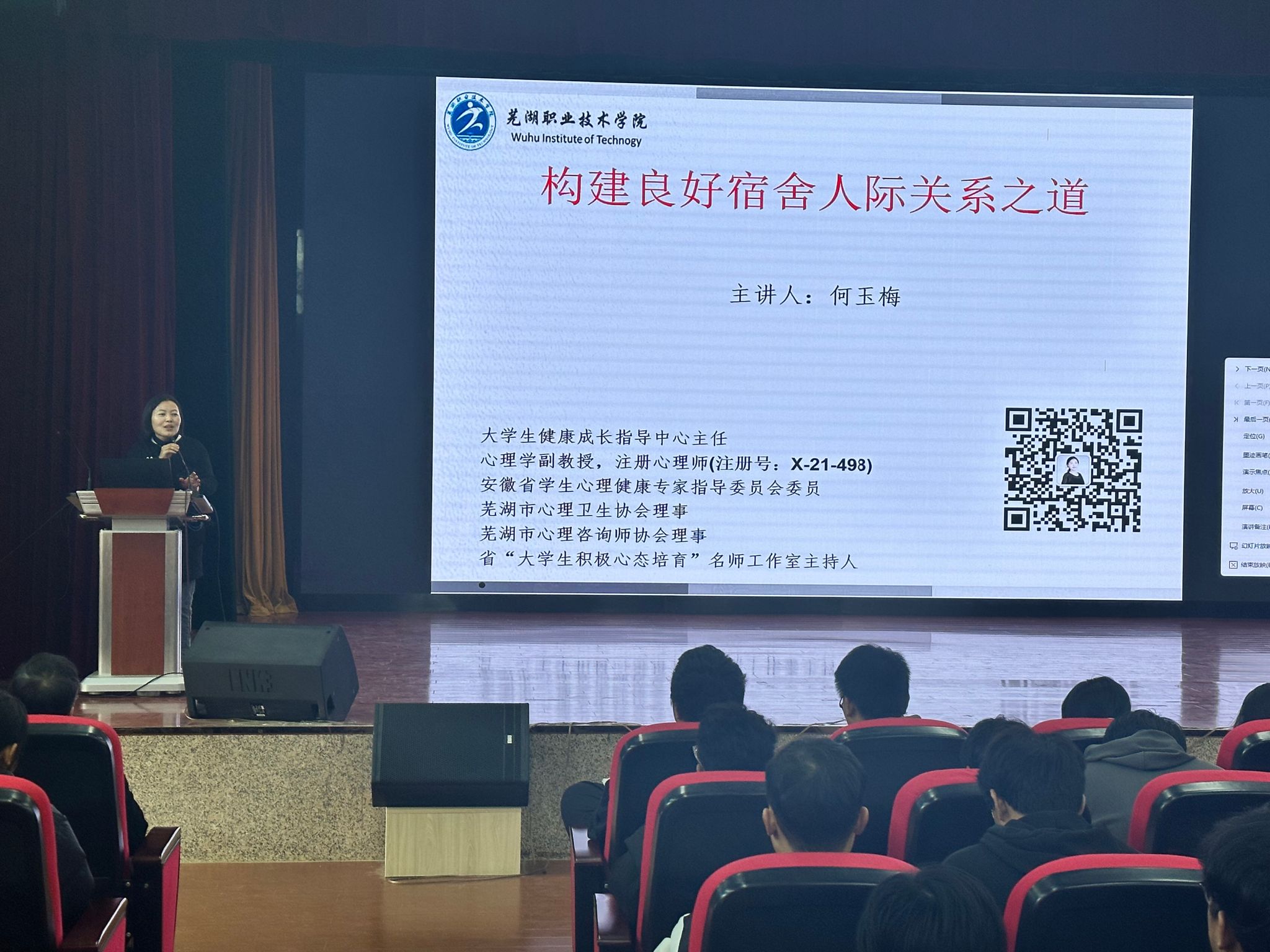 宿舍是大学生的“第一社会、第二家庭、第三课堂”。为帮助新生以良好心态融入大学生活,营造融洽的宿舍关系,11月22日下午,智能制造学院开展“构建良好宿舍人际关系之道”主题心理健康讲座,本次讲座邀请国家注册心理师、校大学生健康成长指导中心主任何玉梅老师为同学们授课,全体2023级新生参加。