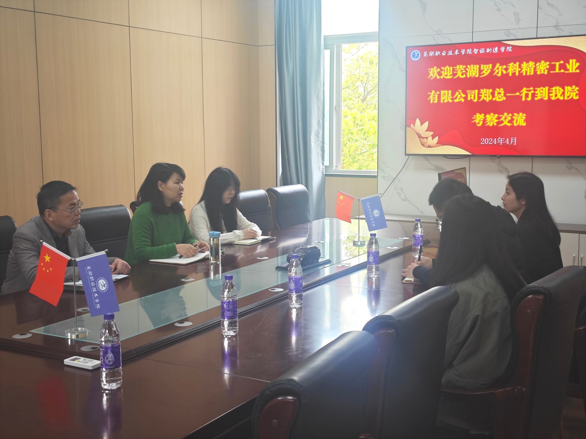 为深化企校对接,强化产教融合,4月10日罗尔科精密工业有限公司董事、总经理粱中华,芜湖罗尔科精密工业有限公司郑婵娟一行到智能制造学院开展校企合作交流,智能制造学院党总支书记计荣、副书记林宗良、辅导员沈文、王慧参加了交流座谈会。