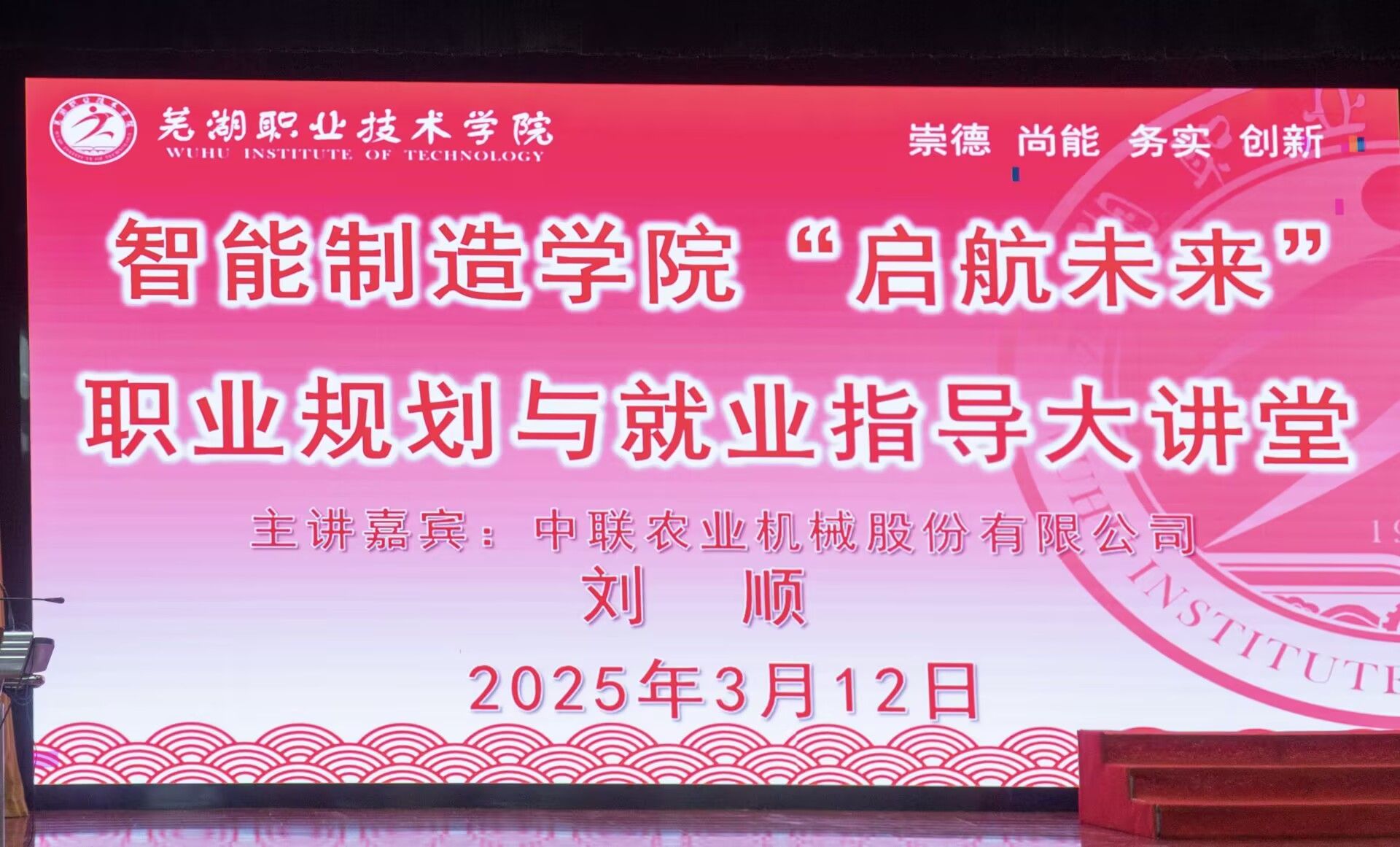 3月12日下午14时,智能制造学院“启航未来”职业规划与就业指导大讲堂首场活动在银湖校区大礼堂举行。中联农业机械股份有限公司人力开发室主任刘顺以《点亮职业灯塔,智启精彩人生》为题,为500余名师生带来了一场理论与实践交融的职业规划讲座,精准赋能学生职业发展。讲座由辅导员曹晓芹主持,2024级全体同学参加。