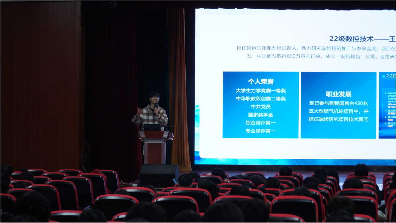 在活动中,黄子轩详细介绍了自己参加大学生职业规划大赛的历程,鼓励同学们积极参与各类活动、实习积累经验,全面提升自己。此外,他还展示了多个机械设计相关岗位的招聘信息,引导同学们对比自身情况,明确存在的差距,并制定相应的提升措施。