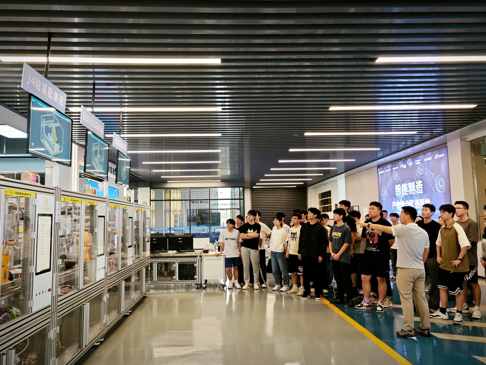 随后,巴智勇老师带领大家参观了智能制造产线。在参观过程中,巴老师结合产线实际情况,分享了前沿技术应用。他详细讲解了智能制造产线中涉及的先进技术,如自动化控制、多轴工业机器人、MES系统在工业生产中的融合应用等,让学生们近距离接触到了行业前沿技术,拓宽了他们的专业视野。