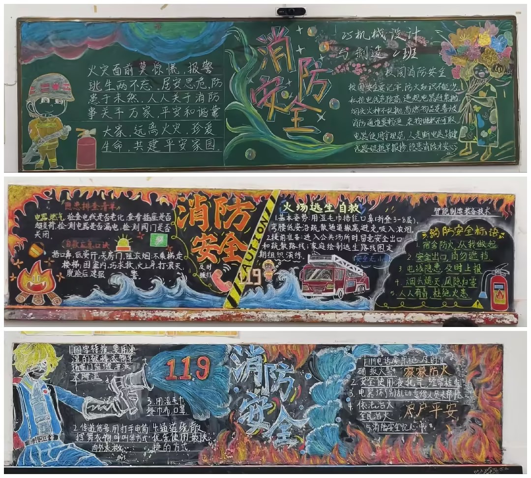 学院围绕“全民消防,生命至上--安全用火用电”主题开展了形式多样的宣传与创作活动。活动开始学院在教学楼显著位置布置了专题宣传海报,营造出浓厚的消防安全氛围。各班以黑板报为载体,集体创作了一期主题鲜明、内容丰富的消防安全宣传内容。此次活动还涵盖个人作品征集,同学们围绕防火和安全用电主题,创作了手绘、PPT、海报、书法、视频等多种形式的作品。本次活动共征集到作品50余份。这些作品设计精美、内容生动,充分展现了同学们对消防安全知识的理解与重视。