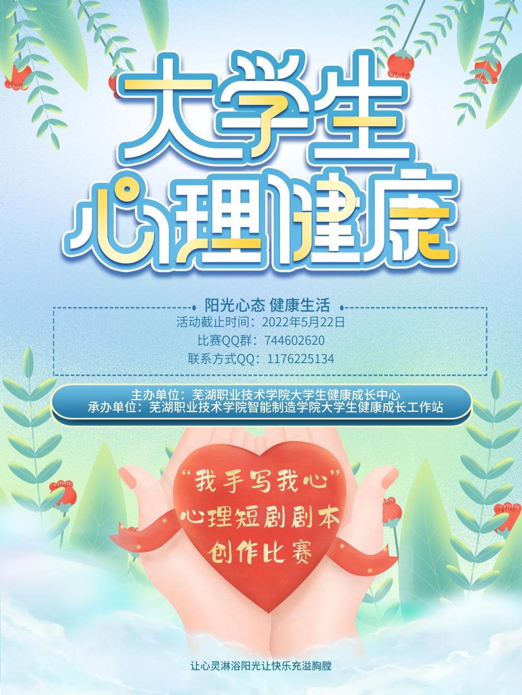 为扎实做好疫情防控常态化形势下学生心理健康教育工作,全面提升工作质量,智能制造学院大学生健康成长工作站在校大学生健康成长中心的指导下,开展了丰富多彩的“5·25”心理健康月系列活动,5月初,工作站启动的“我手写我心”心理短剧剧本创作比赛于近日落下帷幕,此次比赛以积极心理学理念为指导,以培养学生阳光心态、培育积极心理品质、促进学生心理健康发展为目标,助力芜职青年以最好的状态,在青春的赛道上奋力奔跑,以良好的精神风貌喜迎党的二十大胜利召开。