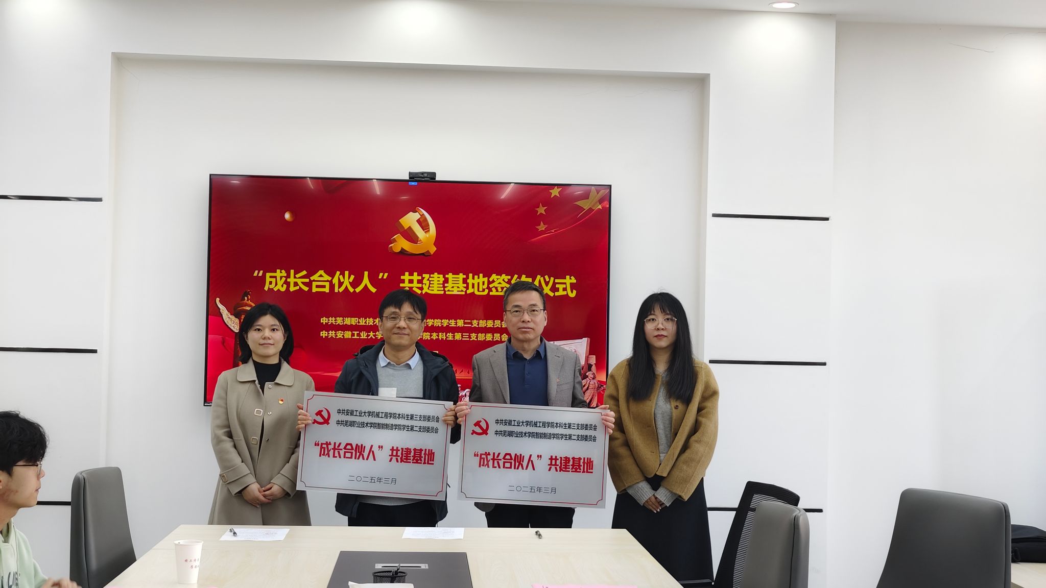 会上,陈洁、林宗良分别介绍了两院的基本情况和党建工作情况。双方聚焦“党团共建机制创新”“党团活动与专业学习协同推进”等议题进行了深入交流。饶思贤提出,双方应联合打造“党团活动+技能实践”品牌项目,通过将党团活动与专业技能实践相结合,为学生提供更多的实践机会和创新平台,从而激发他们的创新活力和实践能力,推动学生在专业领域内的成长和发展。林宗良建议,建立常态化交流平台,推动学生骨干互访互学,为学生提供更多学习与成长的机会,同时加强两院之间的信息共享与资源互补,实现互利共赢的良好局面。之后,机械工程学院本科生第三党支部与芜湖职业技术学院智能制造学院学生第二党支部签署了《“成长合伙人”共建基地合作协议》,明确将在主题党日联办、党员教育共学、志愿服务同行等方面深化合作。